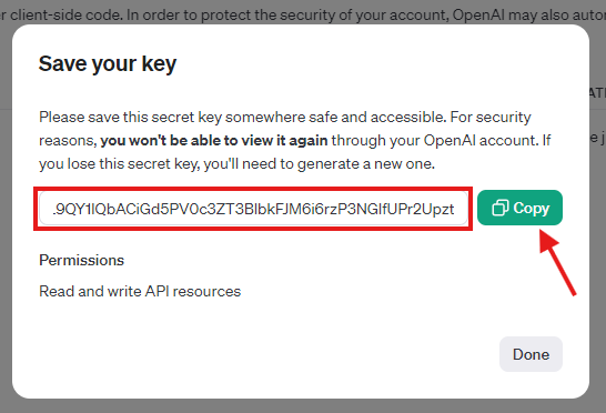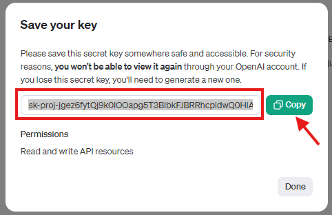 Certifique-se de copiar e armazenar sua chave de API em um local seguro. Veja o exemplo abaixo: