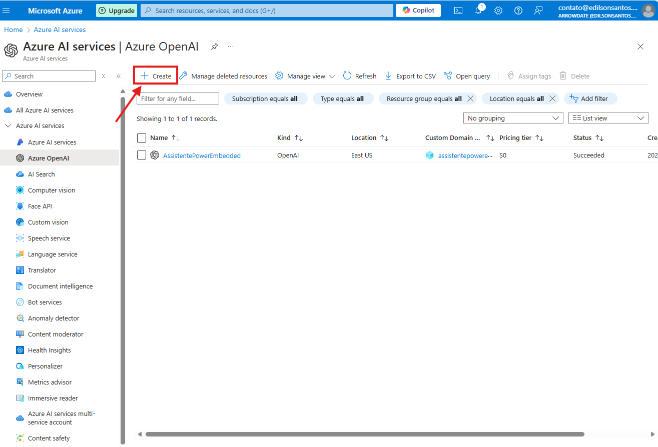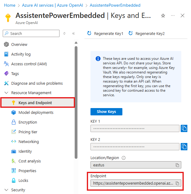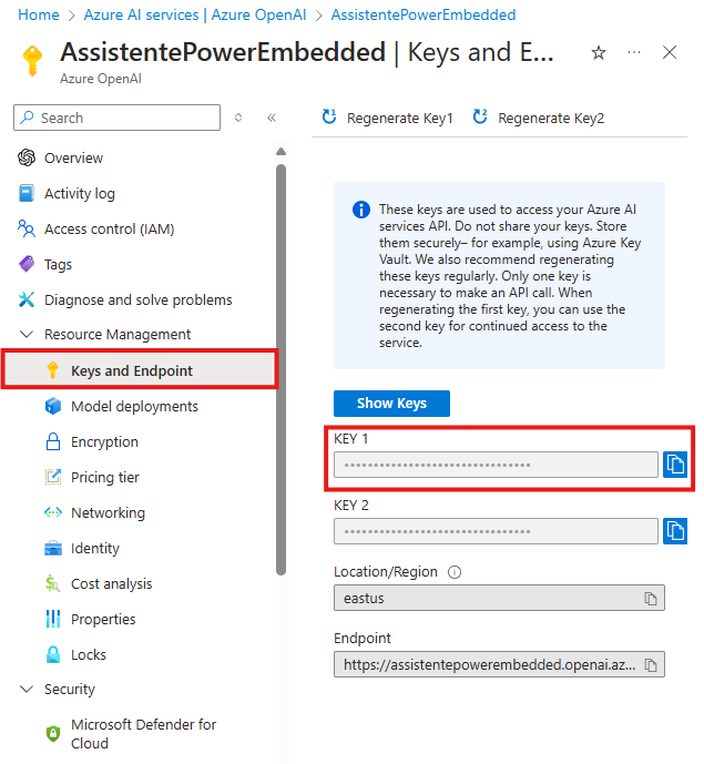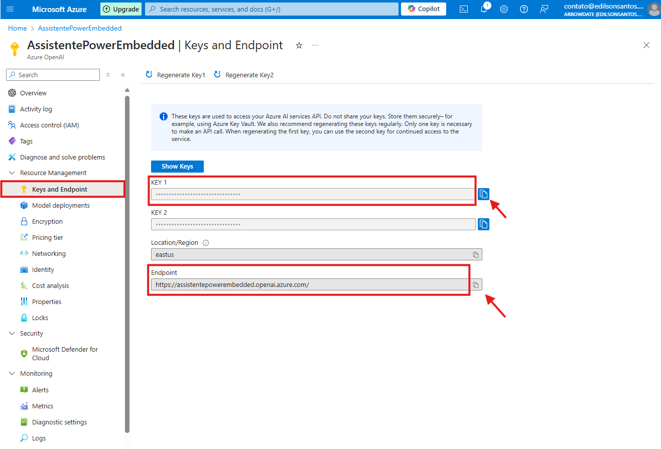 Ao criar o recurso precisamos ir até a aba de “Keys and Endpoint” para copiar dois valores importante que iremos utilizar na criação do Modelo de IA no portal de administração do Power Embedded.