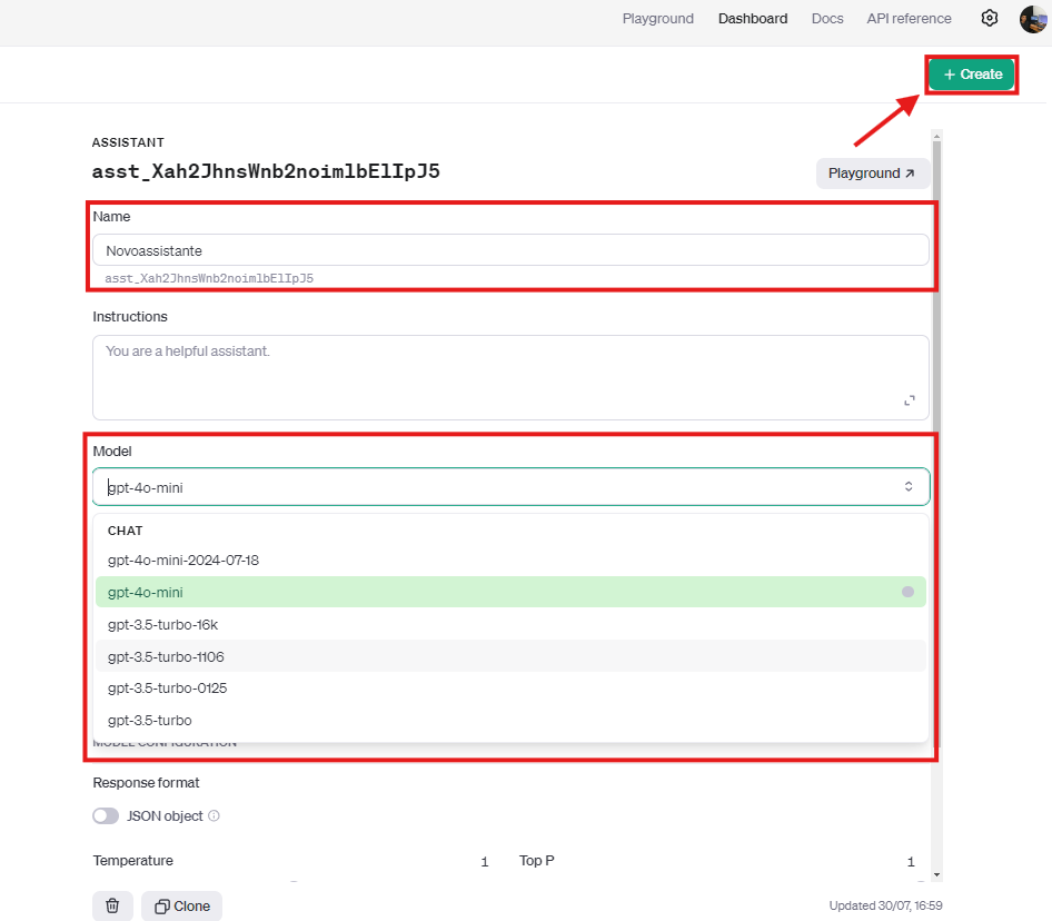 Preencha os campos de nome e defina qual modelo de IA, vai ser utilizado. Para essa documentação estamos utilizando o “gpt-4o-mini” que atualmente tem menor custo por tokens. Ao preencher os campos basta criar o assistente.