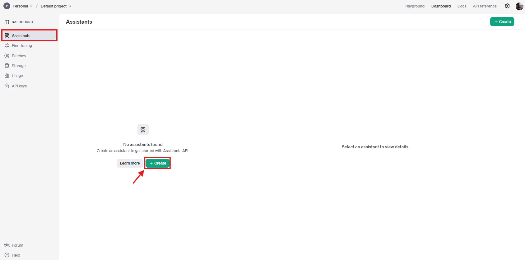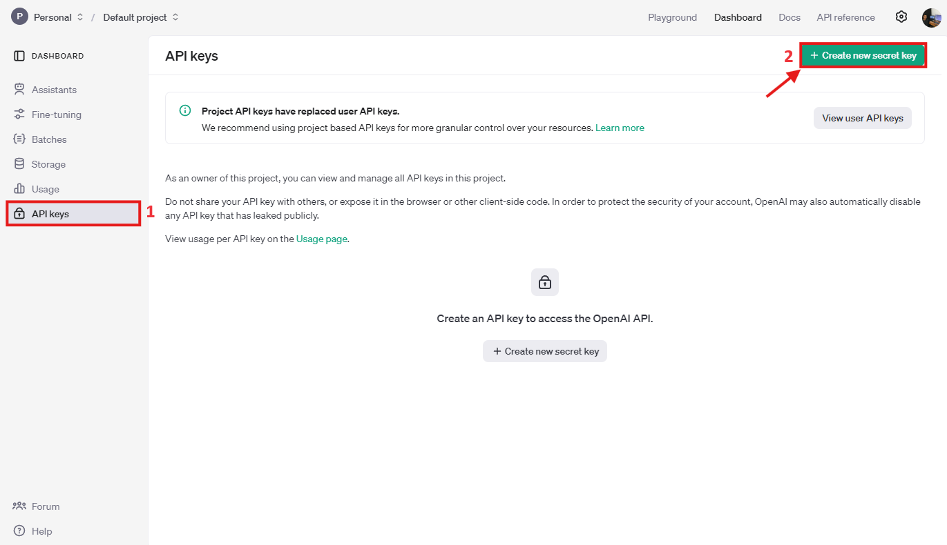 1° Passo – O primeiro passo para criar um assistente pelo OpenAI é preciso criar uma ” Secret Key “. Para isso vá em API Keys > Create new secret key.