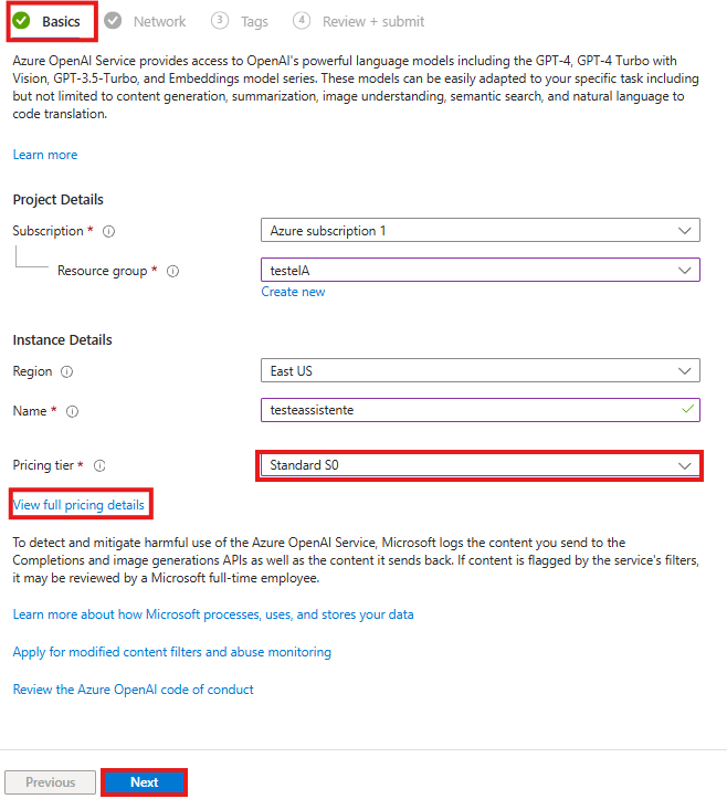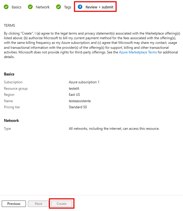 Após verificar os dados e as configurações, basta criar o recurso clicando em “Create”.