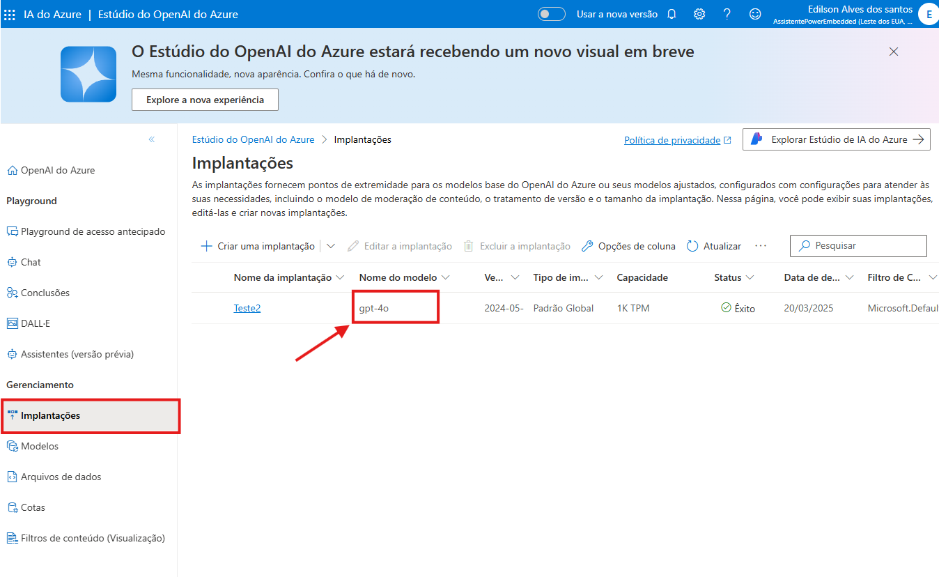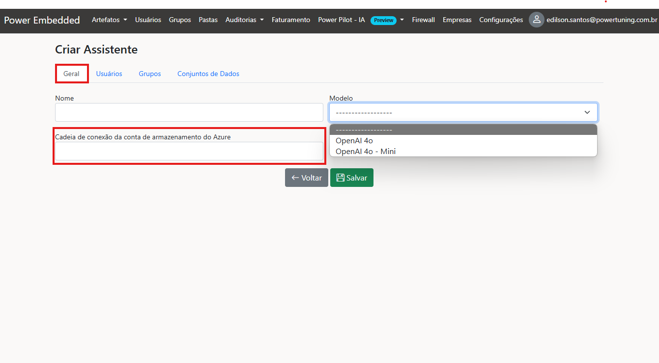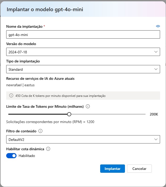 - Modelo: Nesse campo é preciso preencher o nome do modelo contratado. (Exemplo: Gpt-4o-mini, Gpt-4 e etc.)