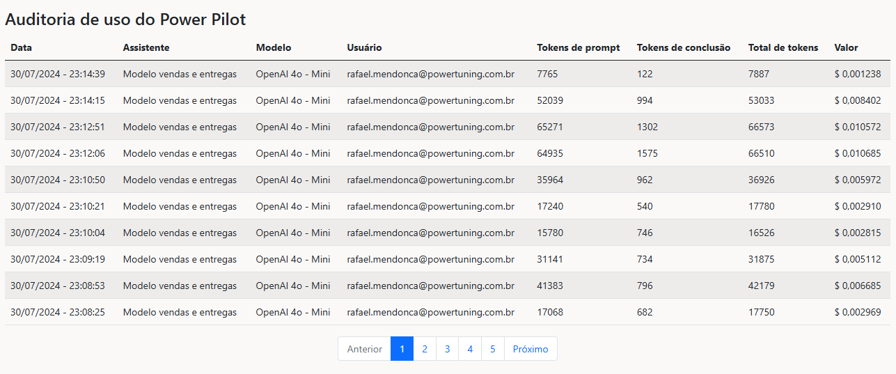 Para fornecer uma visão geral do consumo desse recurso, implementamos auditorias de tokens. Como o uso do recurso é cobrado com base na quantidade de tokens, é crucial ter essa visão detalhada.