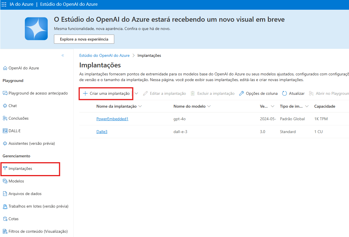 Nessa nova tela vá em Implantações > Criar uma implantação.