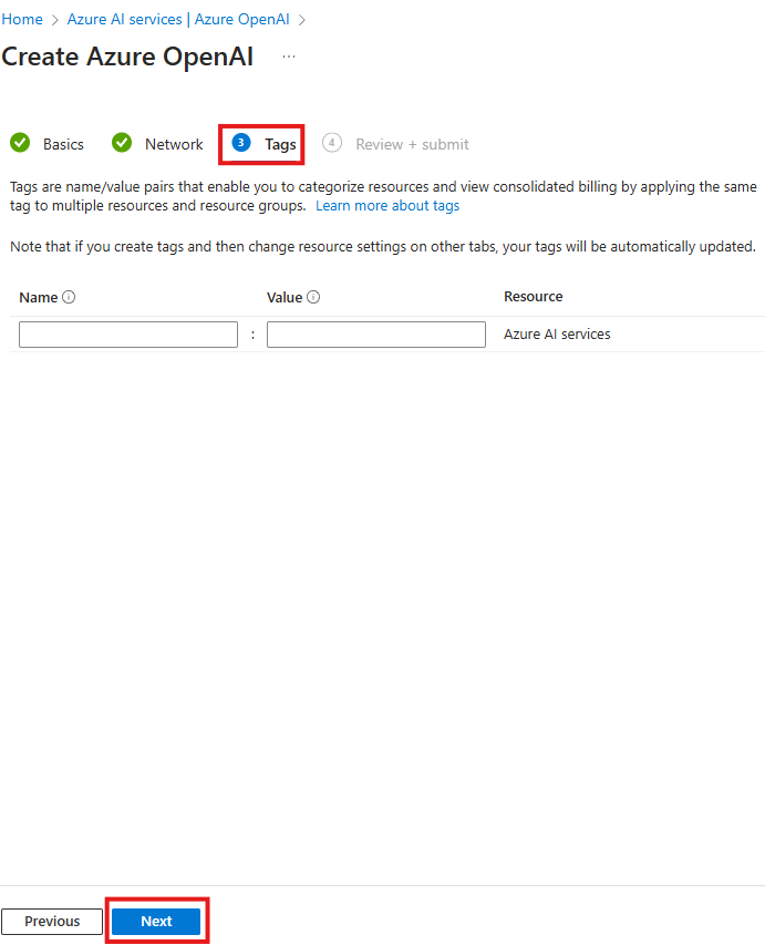 Nessa aba, caso você tenha tags para identificar recursos com base em configurações da empresa, basta associar. Caso não tenha, deixe em branco.