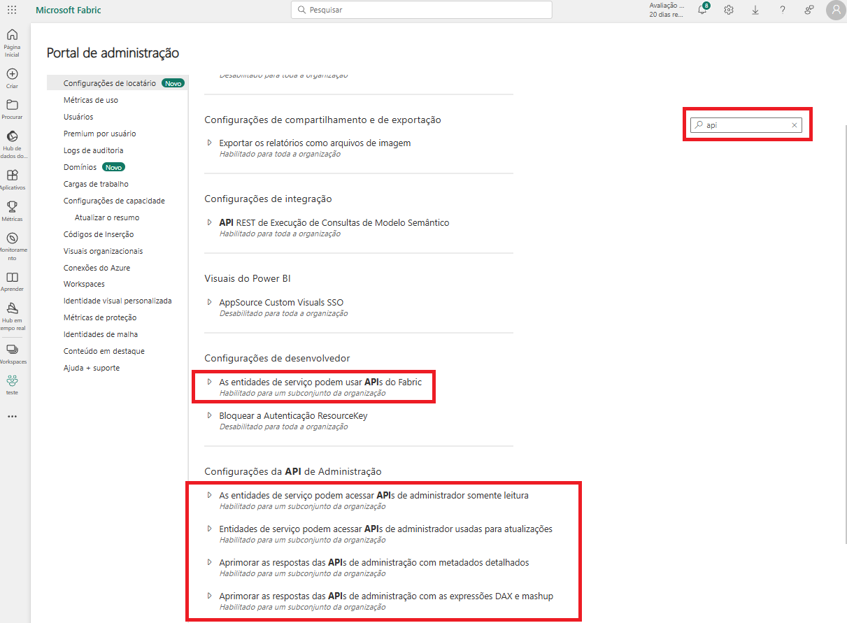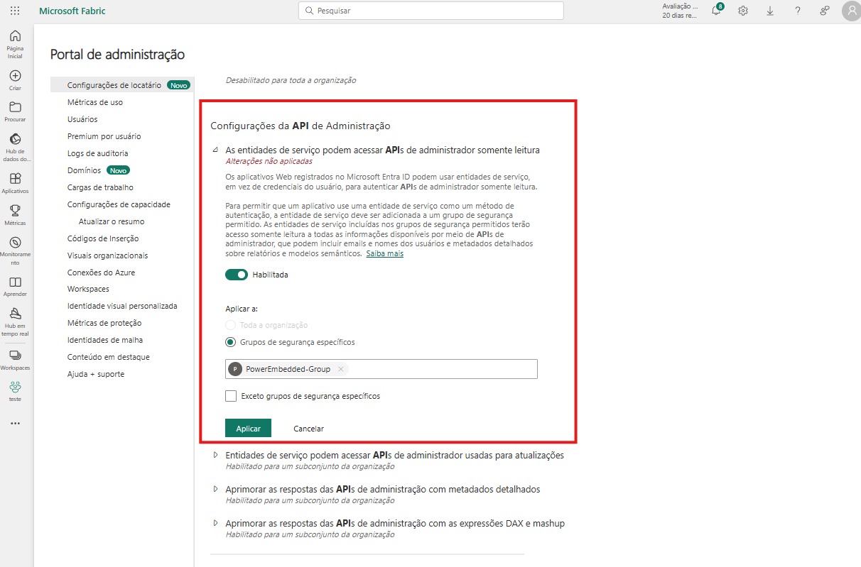 Marque a opção “As entidades de serviço podem usar APIs do Fabric”.