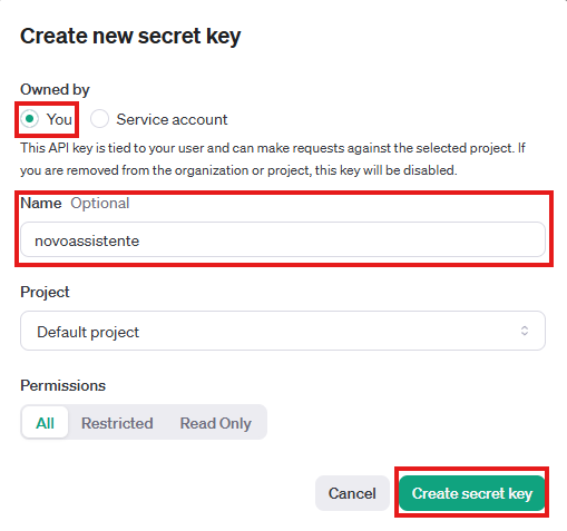 O campo Owned By ou propiedade de , pode manter como padrão, defina um nome para sua chave e clique em Create secrect key