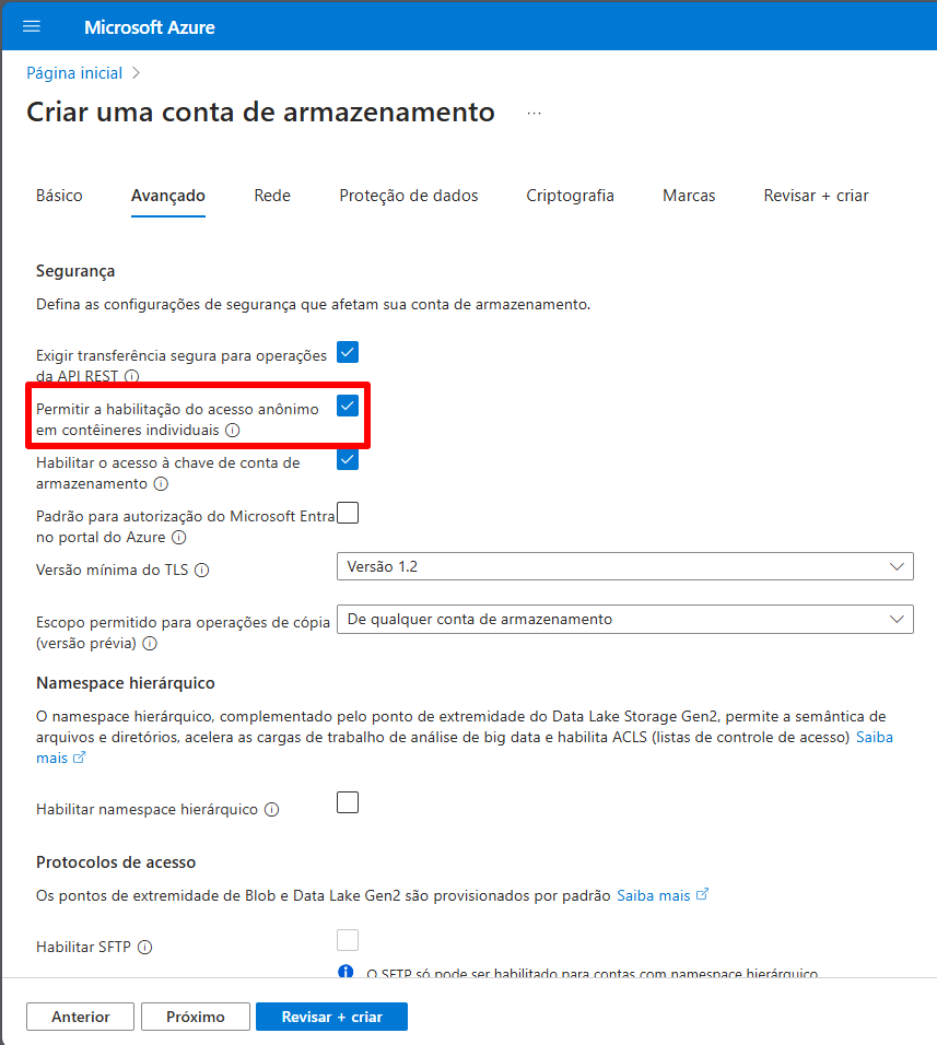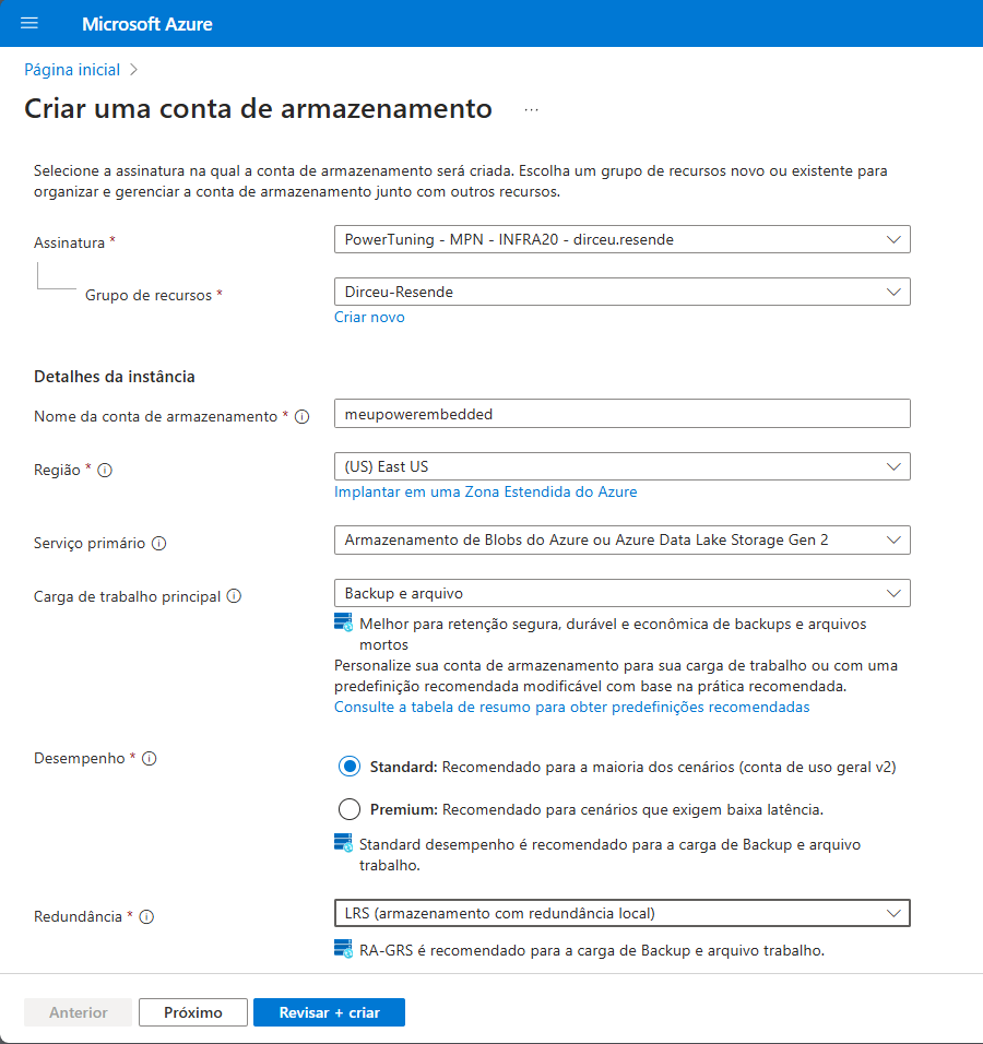 Pode revisar as outras configurações, mas para fins deste tutorial, já pode avançar e concluir a criação da conta de armazenamento.