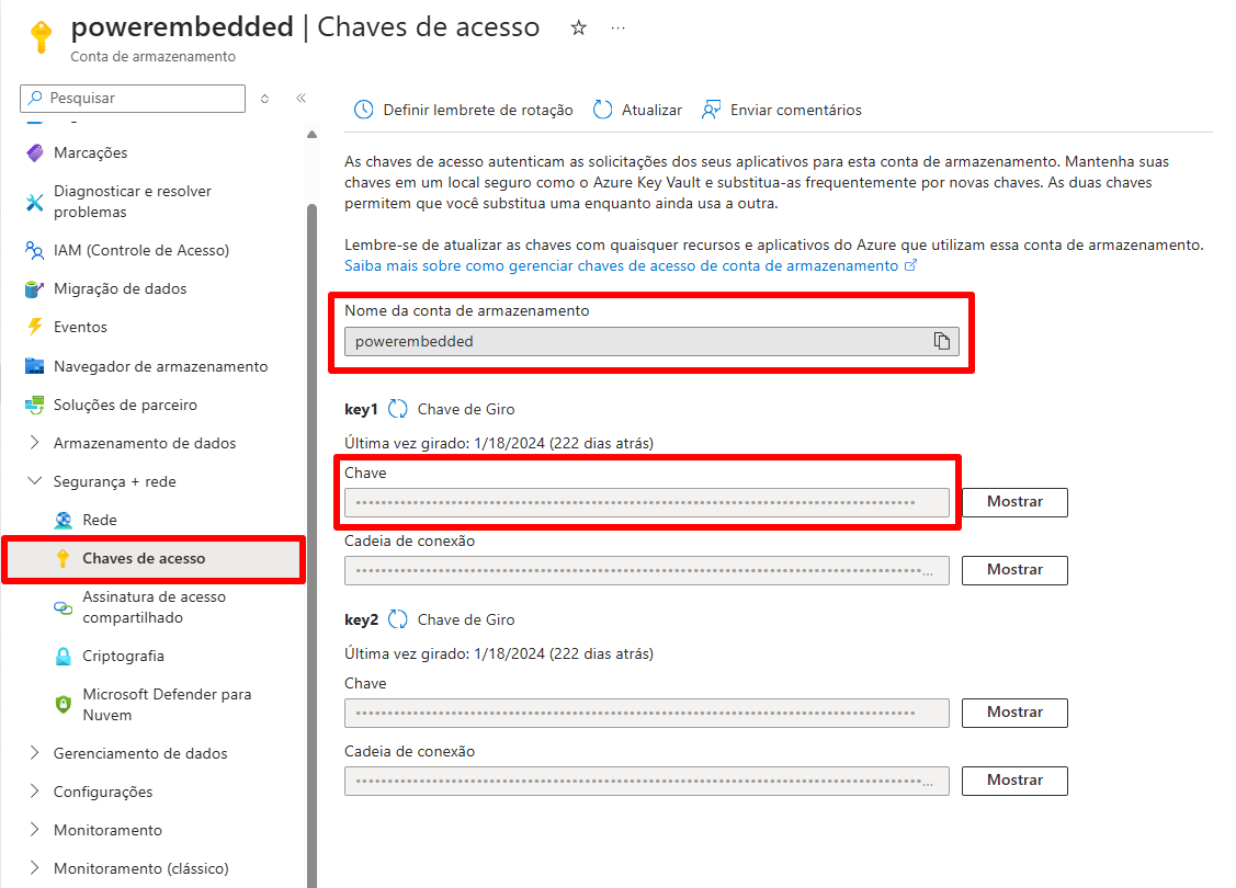 Nesta tela, você irá copiar e salvar em um bloco de notas, os valores dos campos Nome da conta de armazenamento e Chave (precisa clicar no botão Mostrar para conseguir copiar a chave), pois iremos utilizar esses valores na configuração da conta de armazenamento.