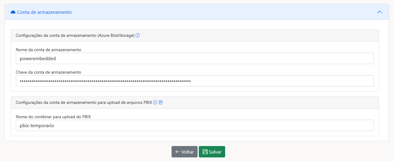 Por padrão, uma conta de armazenamento do próprio Power Embedded é utilizada para esse armazenamento temporários dos arquivos do Power BI. Sendo assim, você não precisa criar ou configurar uma integração do Power Embedded com uma conta de armazenamento.
