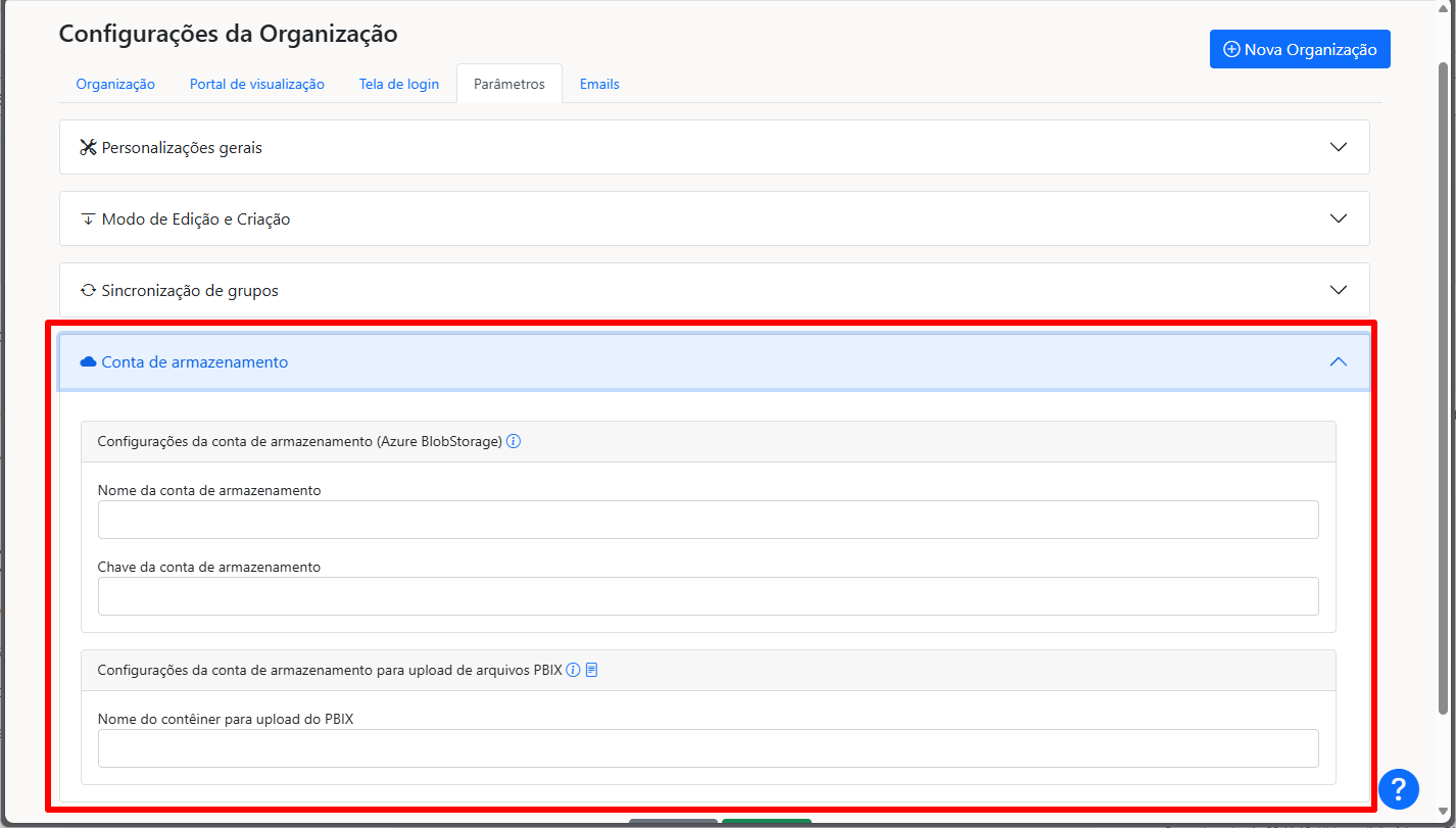 Essa integração utilizando a conta de armazenamento da sua empresa pode ser configurada na tela abaixo, que fica na página de Configurações > Aba Parâmetros: