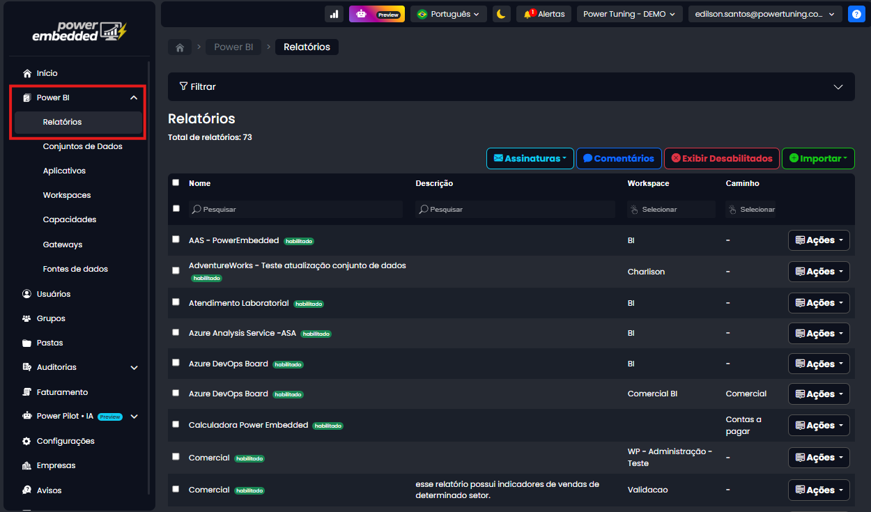 Vá até aba de Power BI > Relatórios > Ações