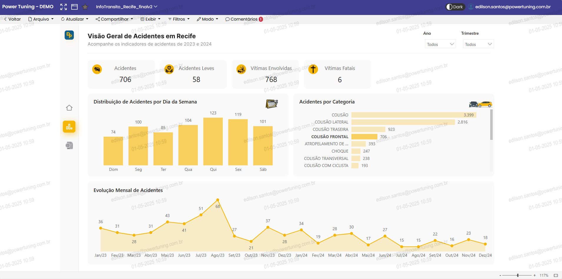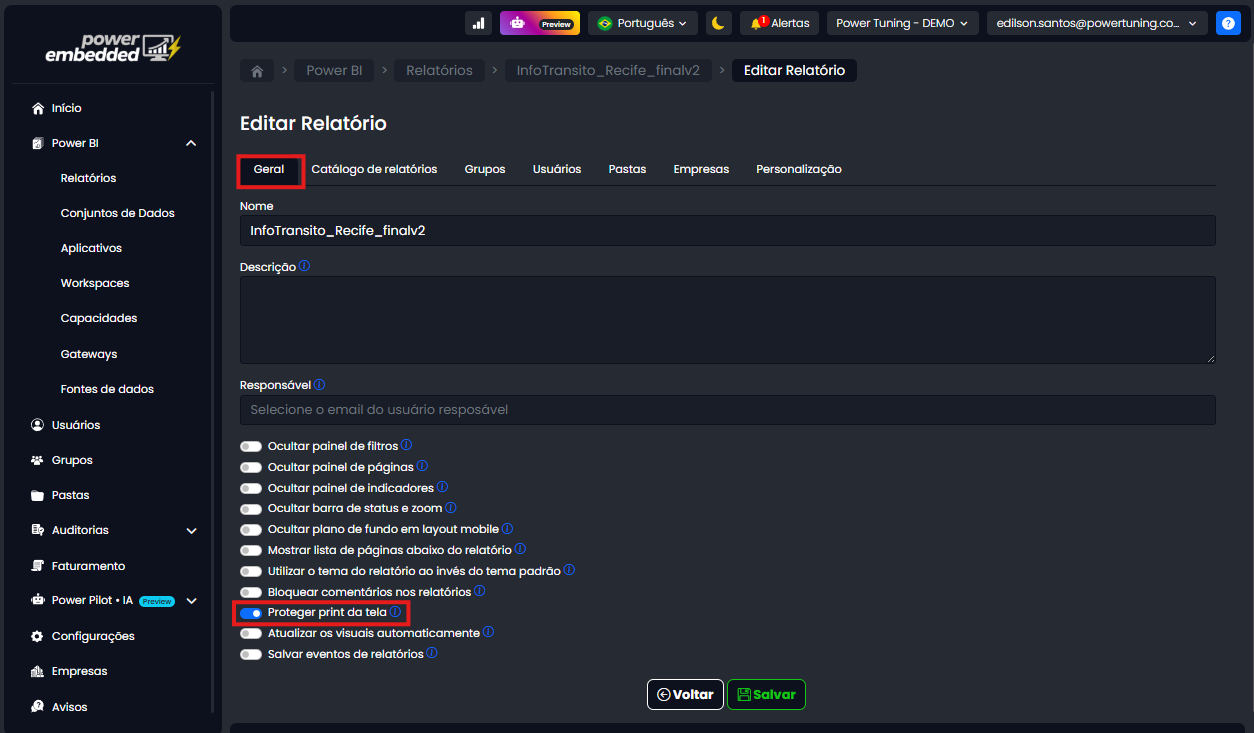 Pensando nisso, lançamos uma nova funcionalidade no Power Embedded: marca d’água automática nos relatórios, com o objetivo de aumentar a segurança e rastreabilidade dos acessos. Com essa funcionalidade, é possível exibir informações como: